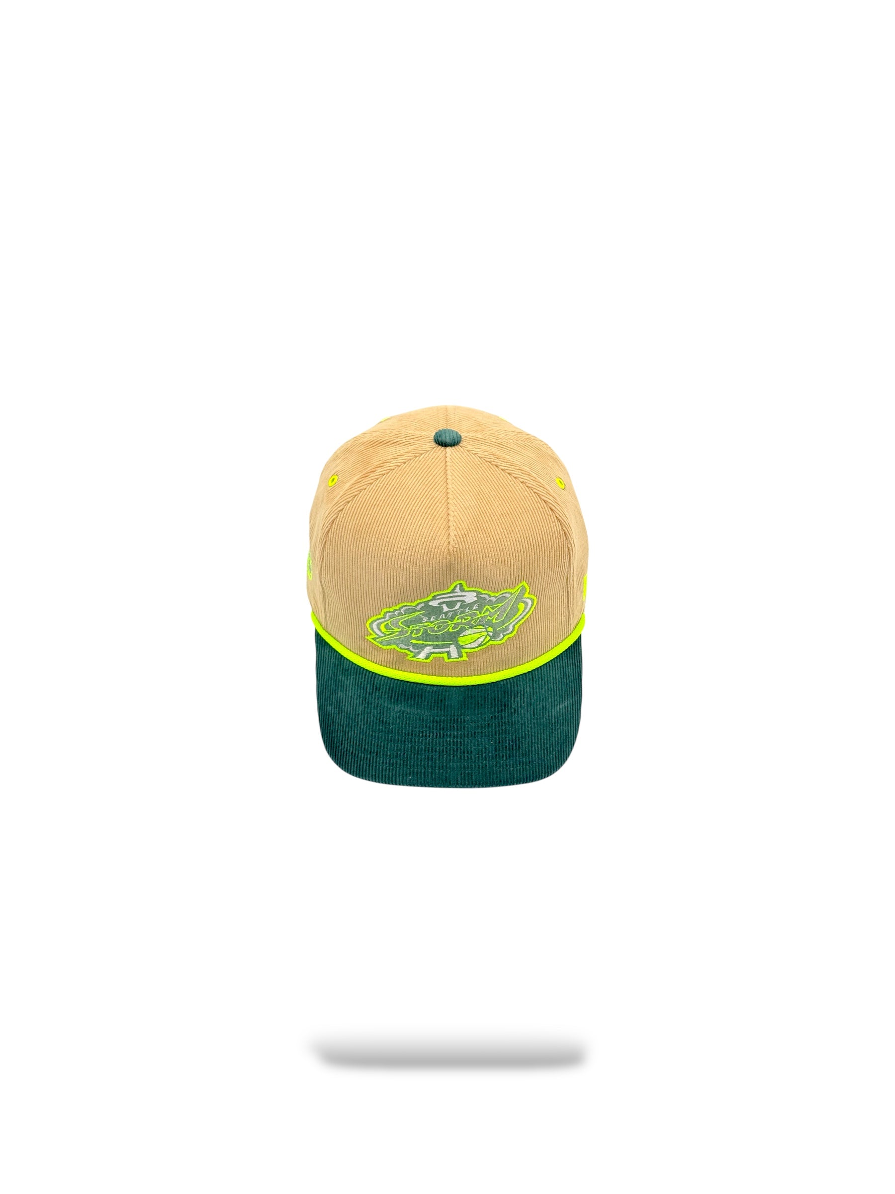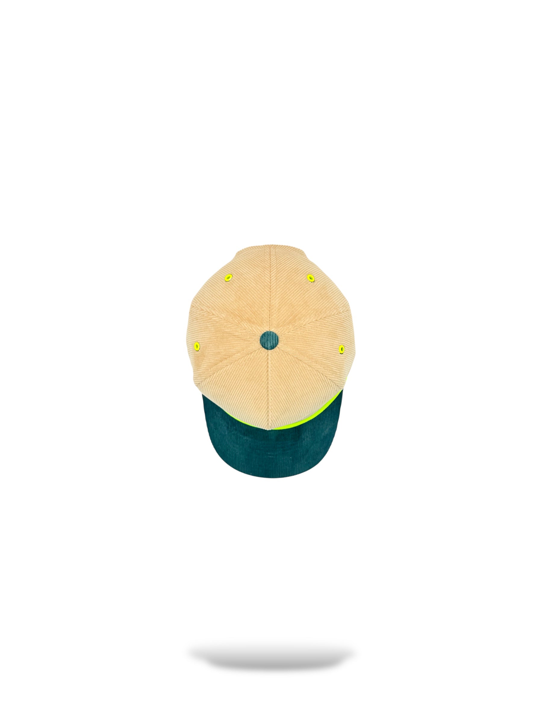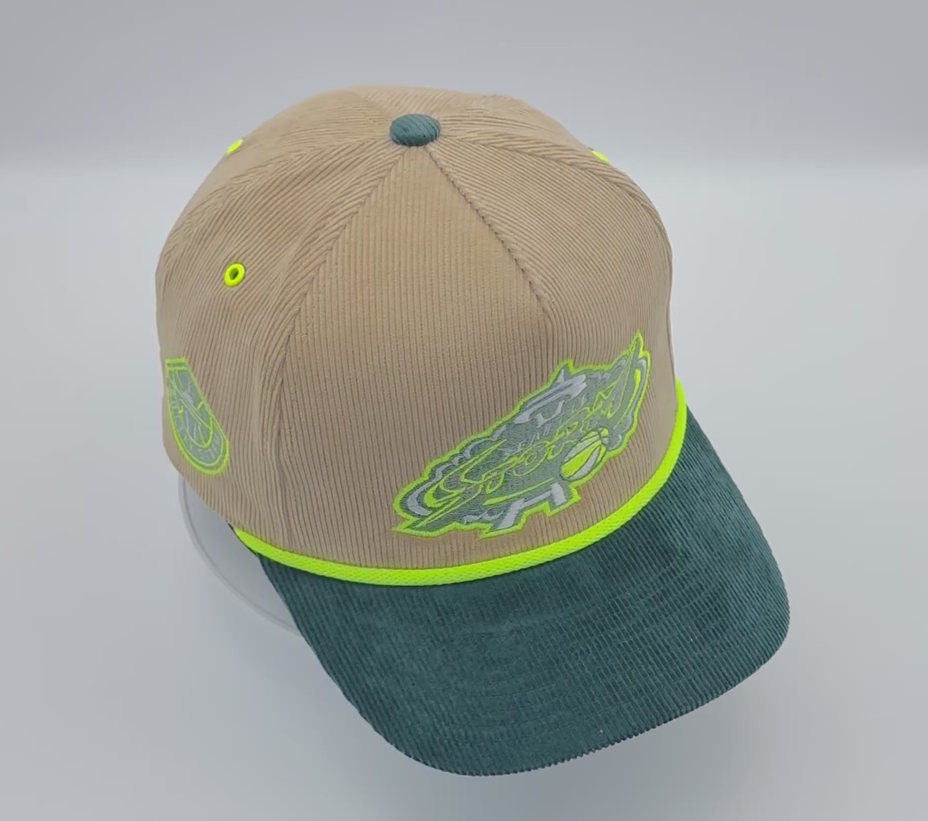 Cordaroy tan with greenish blue brim snap back 5panel hat with lime rope to match logo